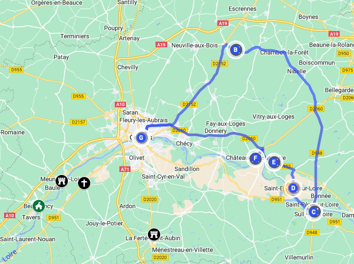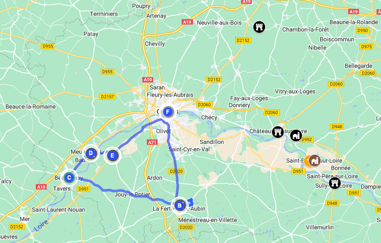 Orléans (A) -> Château de La Ferté-Saint-Aubin (B) -> Beaugency (C) -> Château de Meug-sur-Loire (D) -> Basilique royale de Cléry-Saint-André (E) -> Orléans (F)